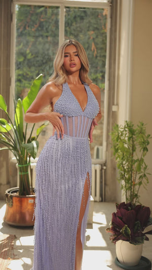 ALYCE Paris 62188 Alyce Long Halter Neckline Fringe Straight Dress