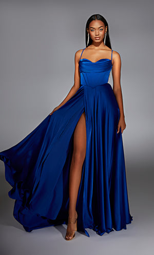 Show a little leg with an eye catching high slit, open split or folded-over slit in long dresses or prom gowns. Sexy prom dresses with slits work best on long prom dresses and ball gowns. Any body type that is comfortable with a showing can wear formal dresses with heart-stopping high slits - especially a red dress with slit.