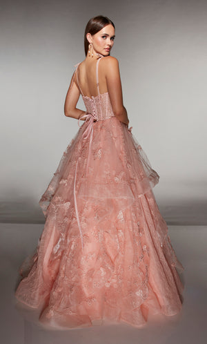 Gowns with lace are considered a timeless, feminine fabric used in the world of special occasions or as lace wedding dresses because there are so many ways to wear it. Lace formal dresses look stunning with both chunky beading as well as light and ethereal sparkle for long and short prom dresses. Lace is a delicate fabric due to its see-through and intricately embroidered patterns; if thick enough, lace’s structure will hide all your body flaws and sins. Soft, stretchy lace is used for long or short lace body con styles and homecoming dresses. ALYCE Paris has the perfect lace prom dresses.