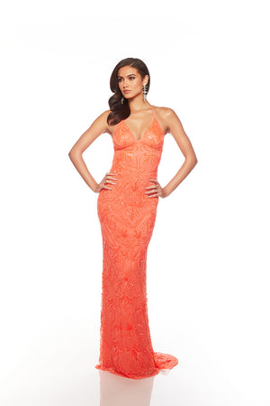 The straight/sheath (or column) silhouette gracefully skims to show off your body’s natural shape. A person with a thicker waist and wider hips will love this silhouette as it hides these flaws very comfortably. An ALYCE Paris formal straight/sheath evening dress style’s straight lines lengthen—and lend an effortless and modern air.