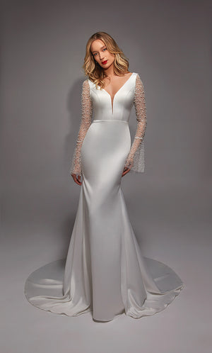 Extra fabric at the back hem that sweeps dramatically behind you. Trains are available in many lengths, and can easily be cut down or altered to your desired length. Trains are particularly desirable on bridal dresses.