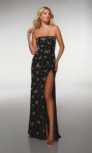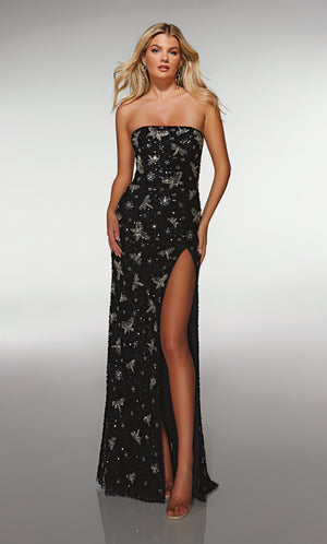 The straight/sheath (or column) silhouette gracefully skims to show off your body’s natural shape. A person with a thicker waist and wider hips will love this silhouette as it hides these flaws very comfortably. An ALYCE Paris formal straight/sheath evening dress style’s straight lines lengthen—and lend an effortless and modern air.