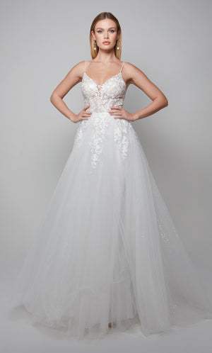 Duchess Alert! A wedding fit for a royal bride is beholden to one of our beautiful ALYCE Paris bridal dresses. ALYCE Paris unique wedding dresses are sure to allure on your big day at price points under $1,000. Find your perfect dream wedding dress available online in our bridal collection in a variety of styles, including black wedding dresses, long sleeve wedding dresses, plus size wedding dresses, even beach wedding dresses. Secret pro tip: call your local retailer to check if this dress can be a custom cut wedding dress in ivory, change the back or add a train! If you find the perfect long white dress, you can always cut down your long formal evening gown into any shapes of short bridal dresses as a last-ditch option!