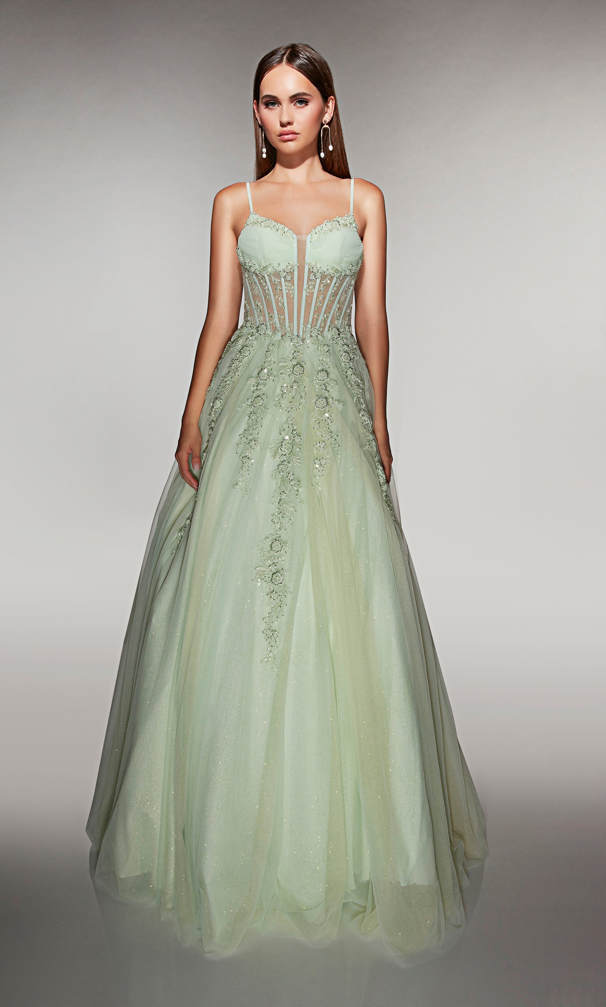 Gowns with lace are considered a timeless, feminine fabric used in the world of special occasions or as lace wedding dresses because there are so many ways to wear it. Lace formal dresses look stunning with both chunky beading as well as light and ethereal sparkle for long and short prom dresses. Lace is a delicate fabric due to its see-through and intricately embroidered patterns; if thick enough, lace’s structure will hide all your body flaws and sins. Soft, stretchy lace is used for long or short lace body con styles and homecoming dresses. ALYCE Paris has the perfect lace prom dresses.