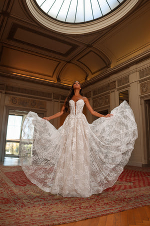 Extra fabric at the back hem that sweeps dramatically behind you. Trains are available in many lengths, and can easily be cut down or altered to your desired length. Trains are particularly desirable on bridal dresses.