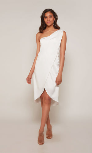 Asymmetrical single strap dress style that exudes a confident, unique goddess vibe and draws attention to your beautiful face and arms. Girls who wear one shoulder prom gowns and cocktail dresses can dance the night away knowing that no wardrobe malfunction will give them a time out on their special occasion. One shoulders are also great for knee length dresses and bridesmaid dresses because they can be dressed up as a formal gown or as a semi formal depending on the right high heels and jewelry.